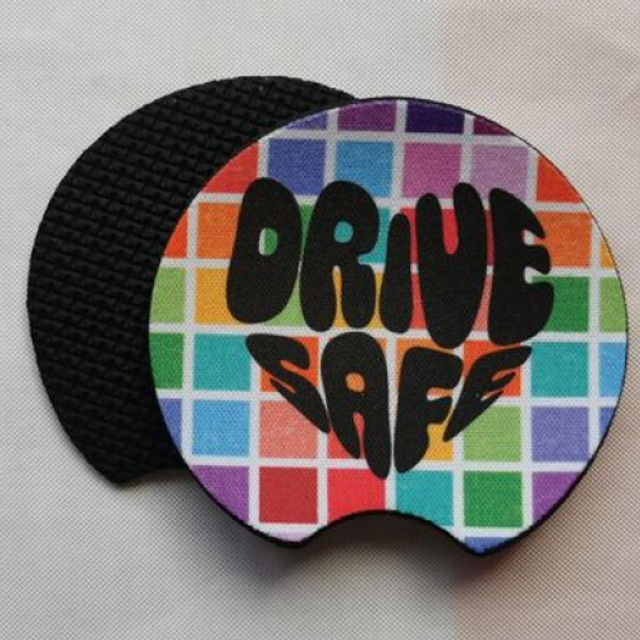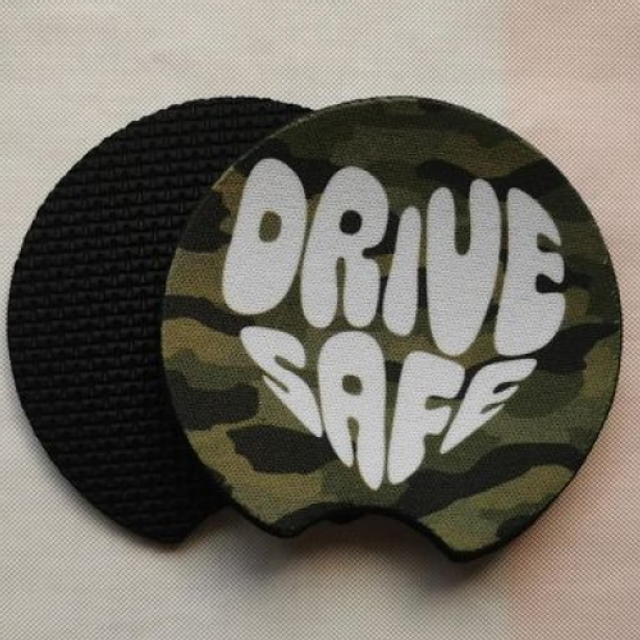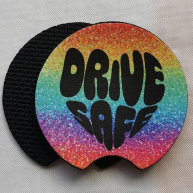 Each coaster features a unique, eye-catching pattern. The "DRIVE SAFE" message is bold and clear.