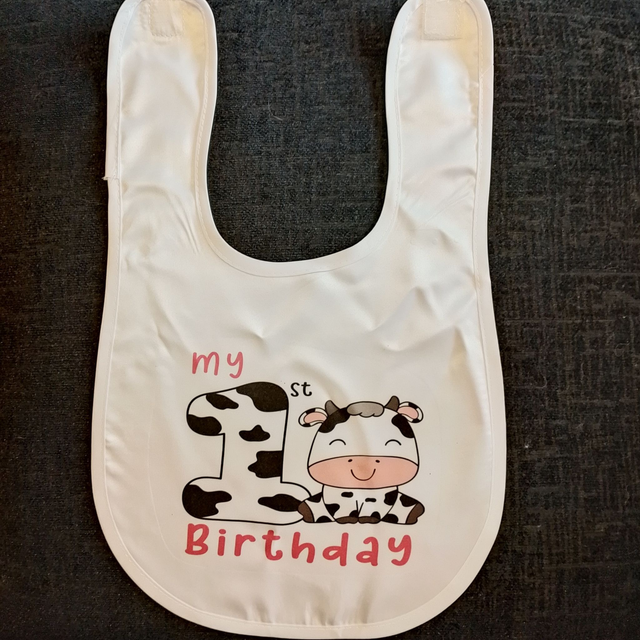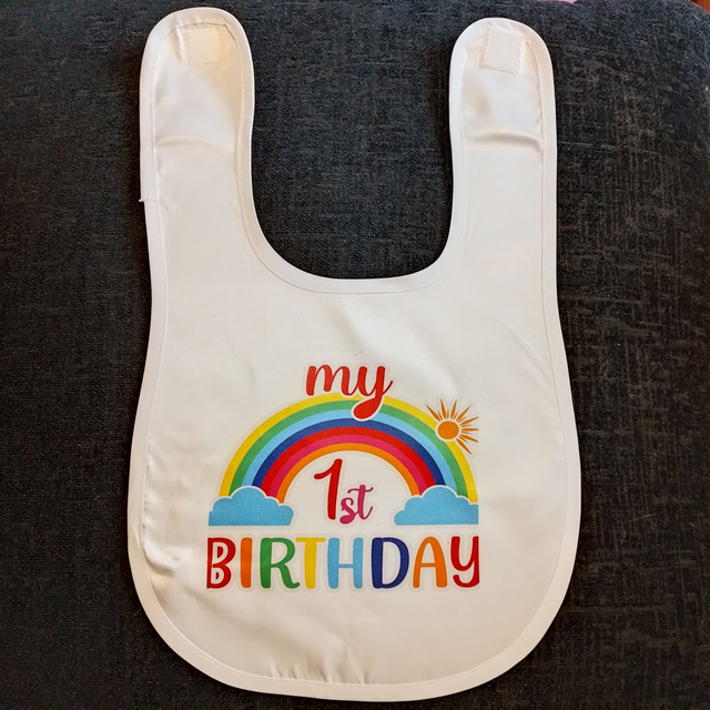 Celebrate your little one's first birthday with this adorable handprinted My 1st Birthday Baby Bib.