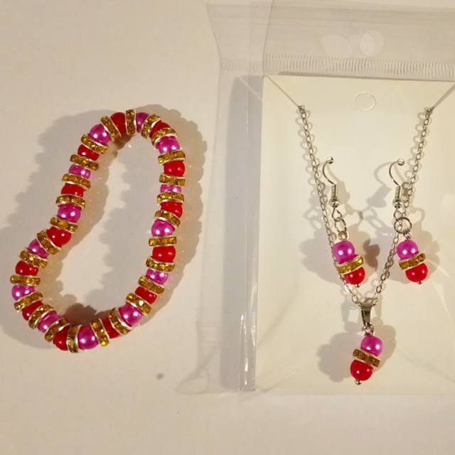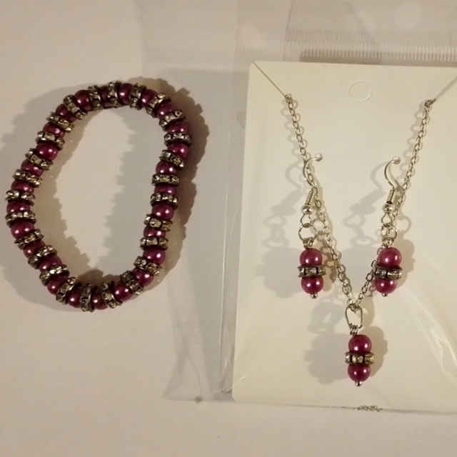 Ladies Handmade Pearlescent & Rhinestone Silver Coloured Necklace, Bracelet & Earring Set - 4 Colours