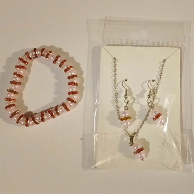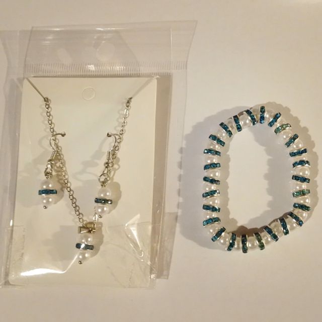 Discover the perfect accessory for any outfit with our Ladies Handmade Pearlescent & Rhinestone Silver Coloured Necklace, Bracelet & Earring Set.