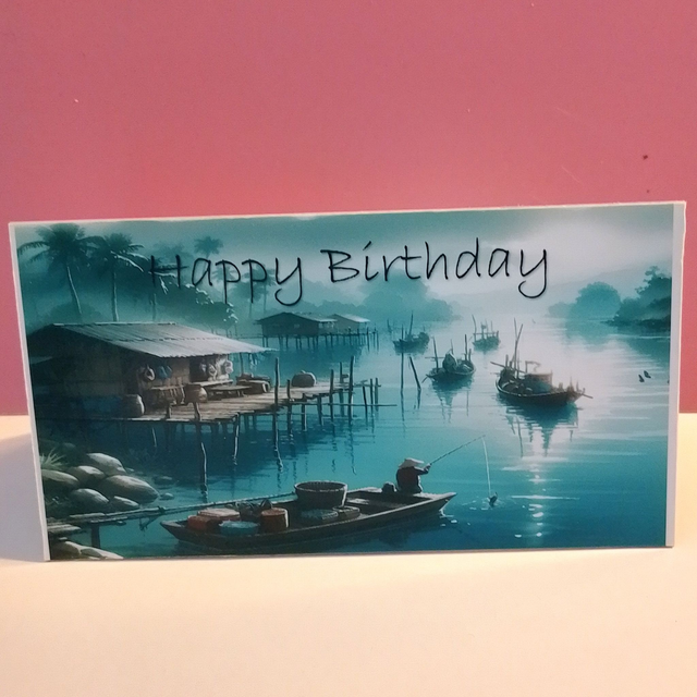 Celebrate a man's birthday with this handmade printed watercolour fishing birthday card featuring four unique designs.