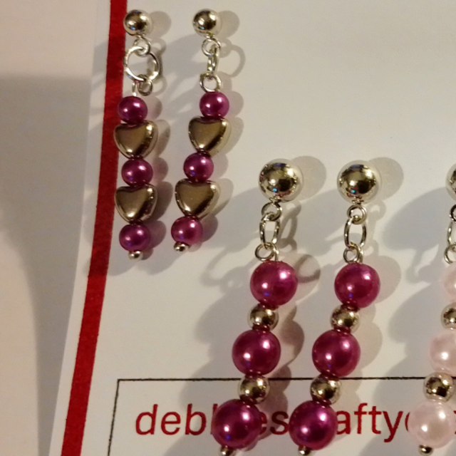 Set of 4 pairs of handmade earrings, each featuring a unique pink pearlescent drop bead.