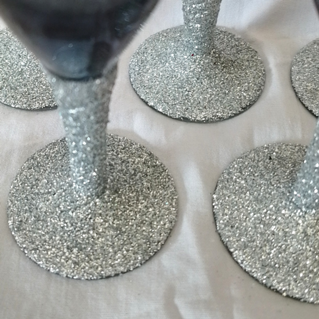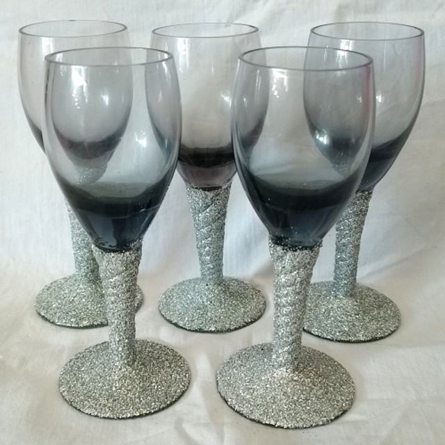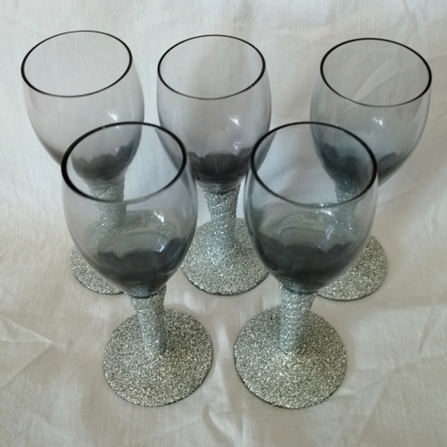 This set includes 5 hand-decorated silver glitter stemmed sherry glasses. Perfect for adding a touch of elegance to your dining table.